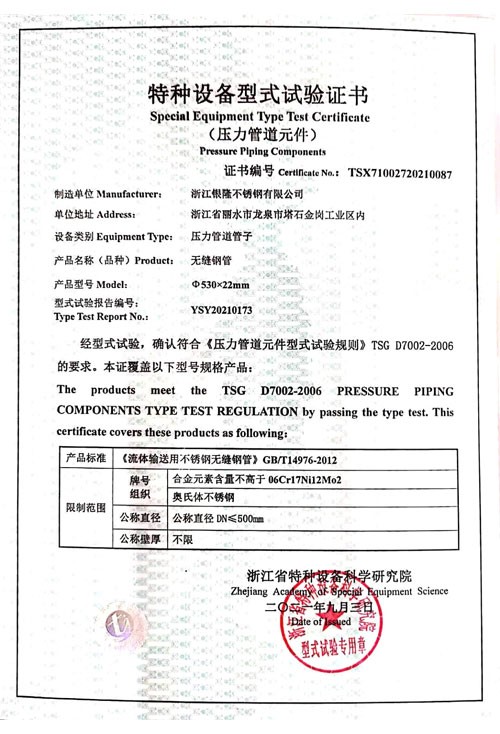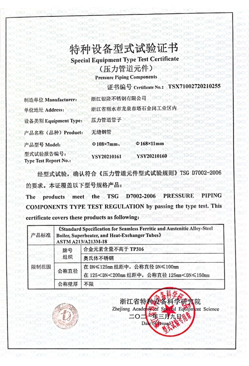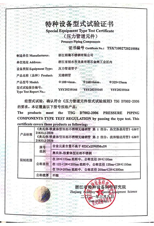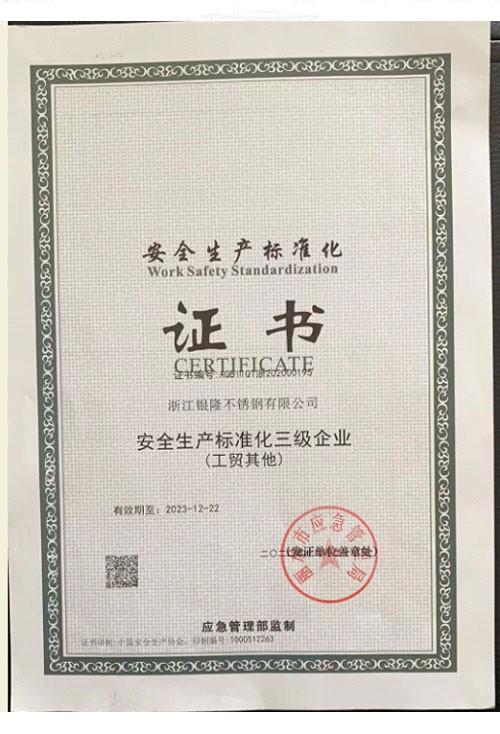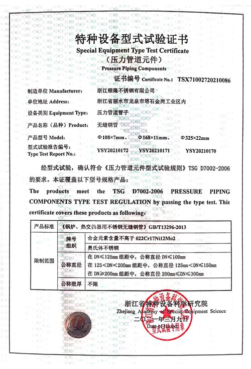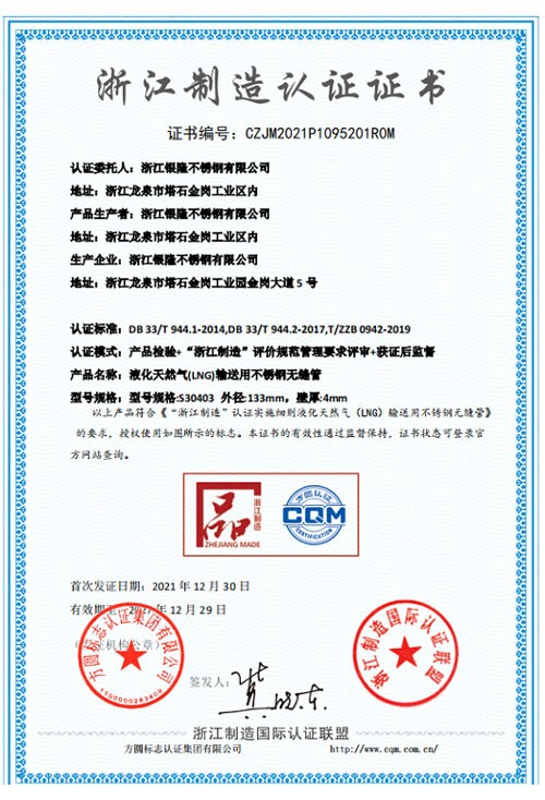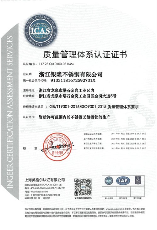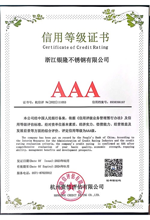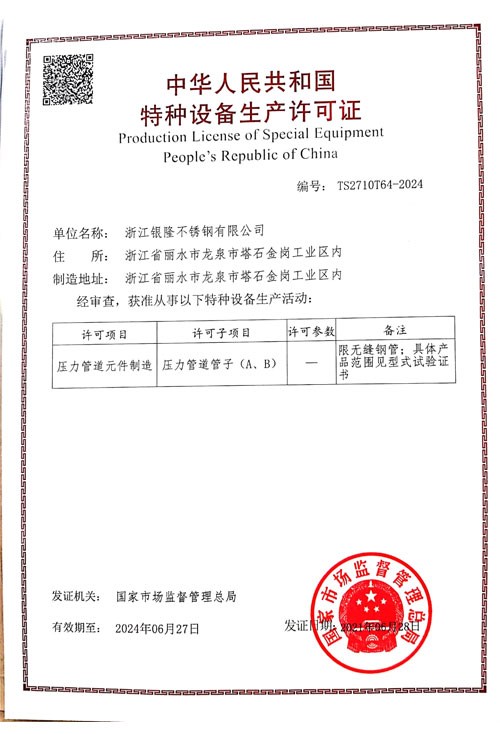 浙江銀隆不銹鋼有限公司創(chuàng)始于2006年,是一家專業(yè)生產(chǎn)不銹鋼無(wú)縫管的企業(yè)。公司位于浙江麗水市,企業(yè)注冊(cè)總資金貳億壹仟柒佰肆拾玖萬(wàn)元,擁有4家工廠,占地總面積11萬(wàn)平方米,職工530人,年產(chǎn)不銹鋼無(wú)縫管5萬(wàn)噸。